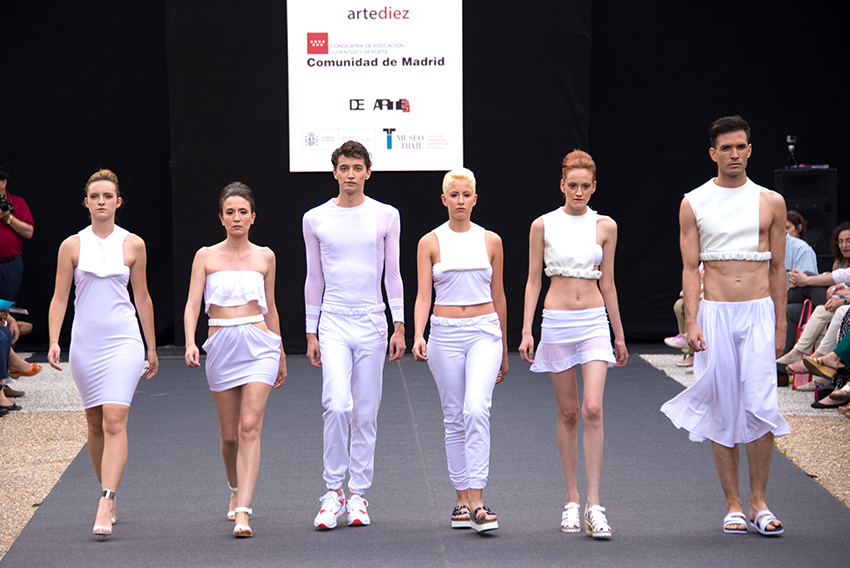 En la fotografía que aparece a continuación tenéis la colección» Blank Canvas» que diseñó para su proyecto final en la Escuela de ArteDiez. La imagen muestra el desfile que se llevó a cabo en el Museo del Traje de Madrid.