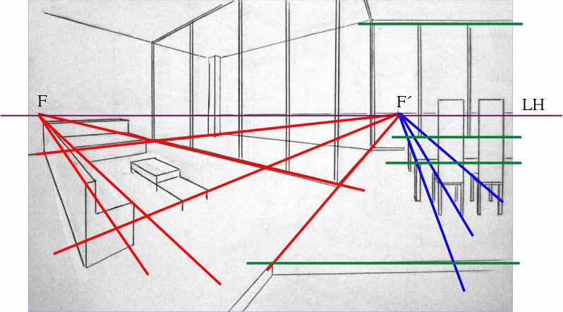 El punto de fuga (F´) sería el punto de fuga de la cónica frontal y a la vez uno de los puntos de fuga de la cónica oblicua. Las líneas marcadas en color verde son paralelas al plano del cuadro, por tanto, las rectas perpendiculares a las mismas, marcadas de color azul, fugan a (F´). Las líneas marcadas de color rojo son algunas de las rectas auxiliares que se han empleado para dibujar la cónica oblicua.