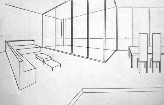 Es posible que en un dibujo aparezcan una perspectiva cónica oblicua y otra frontal al mismo tiempo, como se puede apreciar en la ilustración anterior. Esto se debe a que algunos objetos que figuran en ella están colocados de forma oblicua con respecto al plano del cuadro, como el sofá rinconera, y otros son paralelos al mismo, como las sillas y las mesas que aparecen a la derecha del dibujo.