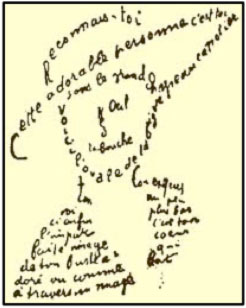 Este interés por la abstracción y la unión de la luz con la música a través del color, dio lugar a un movimiento llamado por el matrimonio Delaunay “Simultaneísmo” y rebautizado como “Orfismo” por Apollinaire, artista nacido en Roma en 1880 y fallecido en París en 1918, especialmente conocido por sus Caligramas, como el de la fotografía que ilustra este texto, a través de los cuales nació la poesía visual, recurso que permitía fusionar el verso con la imagen, del mismo modo que Delaunay unió la luz con el sonido. Diferentes maneras de integrar varios elementos en una única composición: luz, sonido, color, poesía, ritmo, rima, formas, abstracción, detalle, movimiento y… mitología, porque con el nombre de Orfismo Apollinaire transmitió la similitud establecida por Delaunay entre el comportamiento de la música y la luz, ambas carentes de materia y transmisoras de la misma energía circular capaz de regir el Universo.