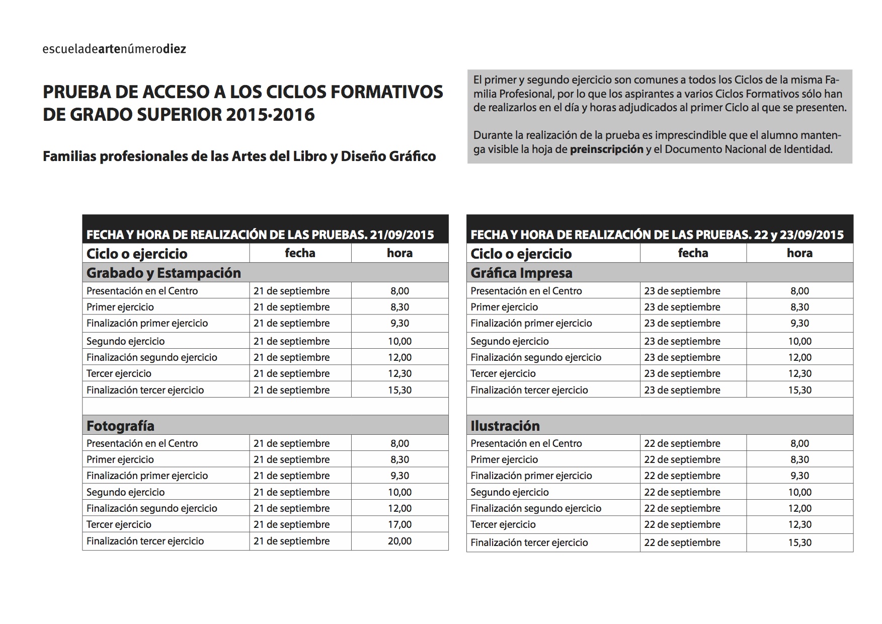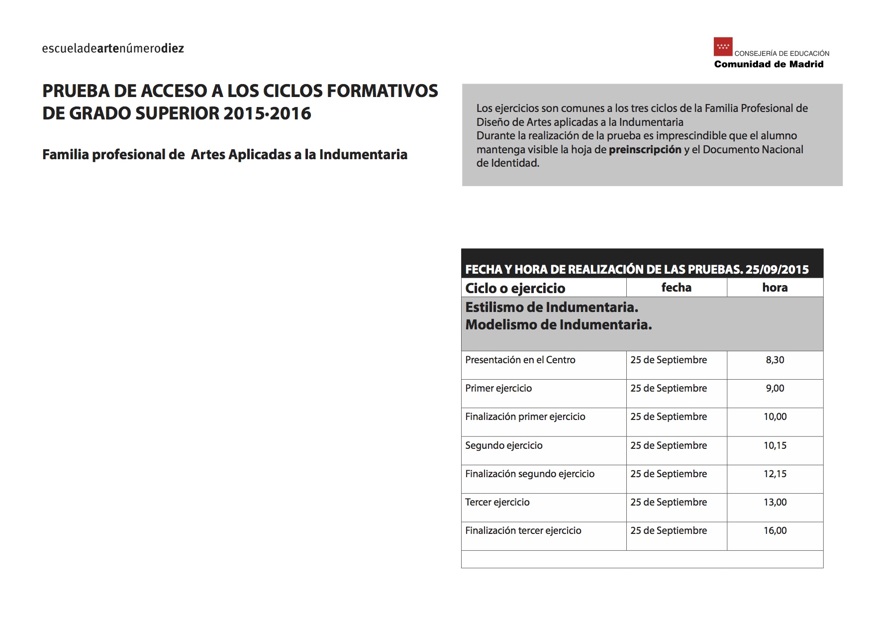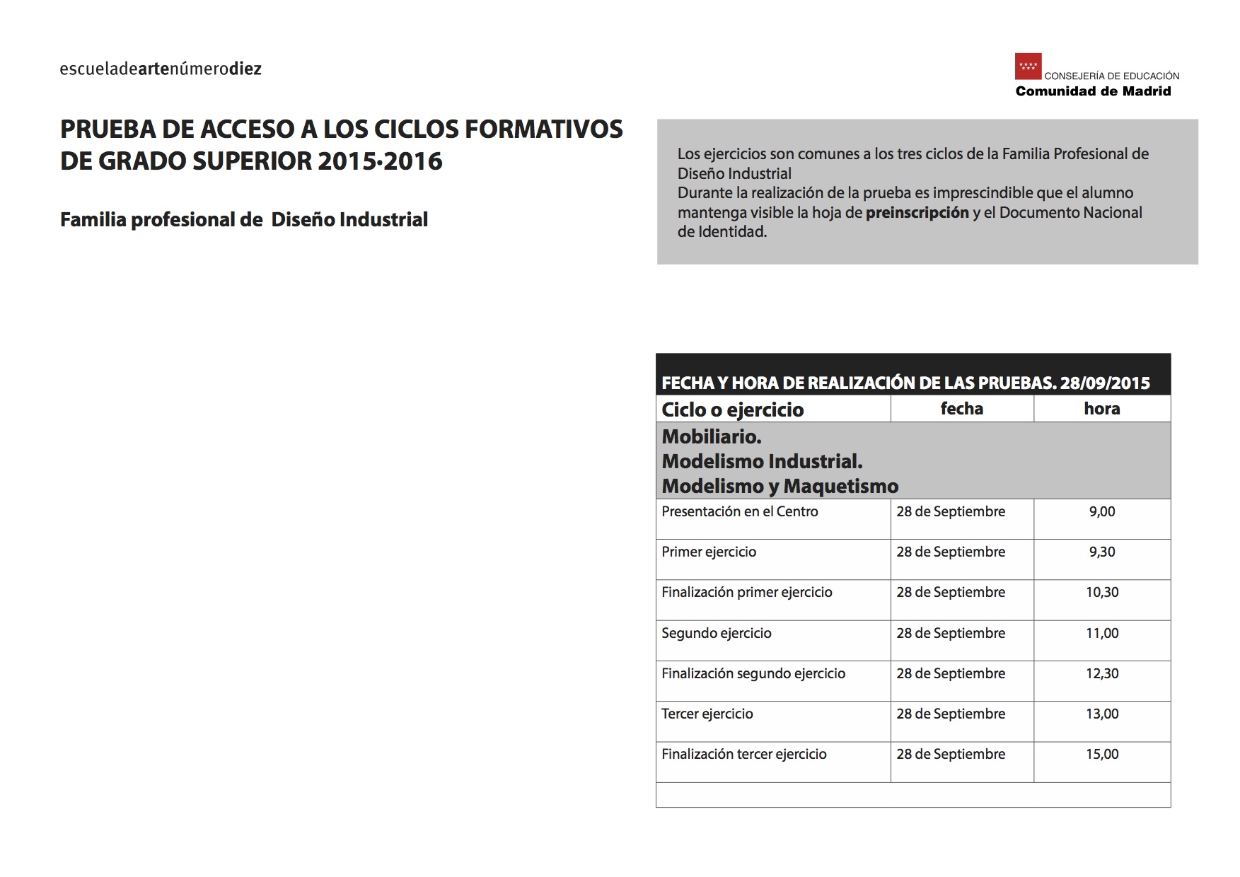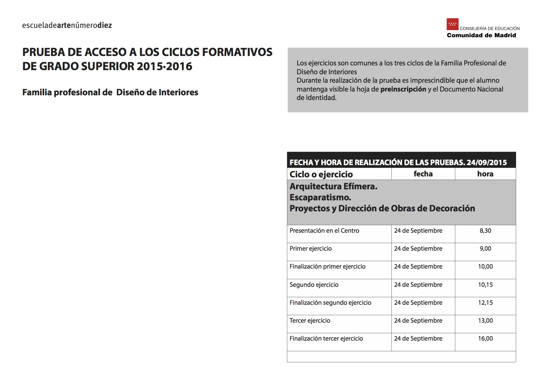 Pongo a vuestra disposición las fechas de las pruebas específicas de acceso a los Ciclos Formativos de Grado Superior de Artes Plásticas y Diseño de la Escuela de Arte 10 de Madrid.