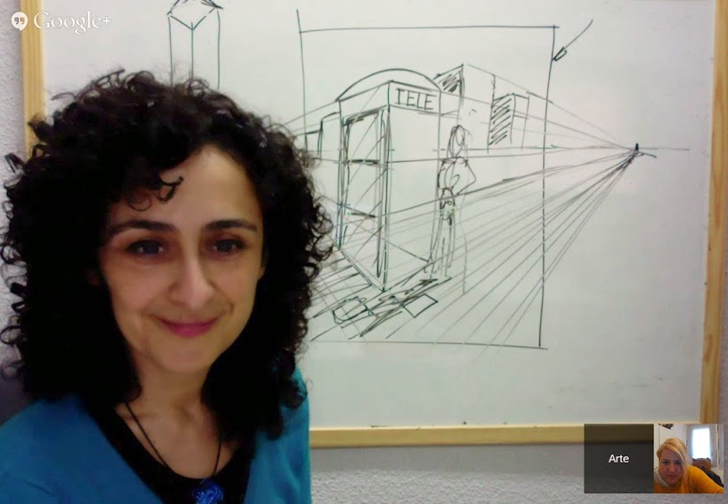 Cristina Barba empezó a preparar la prueba específica de acceso a la ESD de Madrid desde Jaca empleando las clases por videoconferencia en directo online. Hace un mes se trasladó a Madrid y actualmente acude a clases presenciales. En la imagen que aparece arriba tenéis a Cristina en una fotografía que ella misma tomó en clase empleando la cámara que la aplicación Hangout de Gmail pone a disposición de sus usuarios.