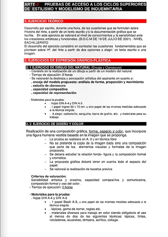Pongo a vuestra disposición las partes del examen de acceso del 2012 al Ciclo Formativo Superior de Estilismo y Modelismo de Indumentaria de la Escuela de Arte 10 en Madrid: